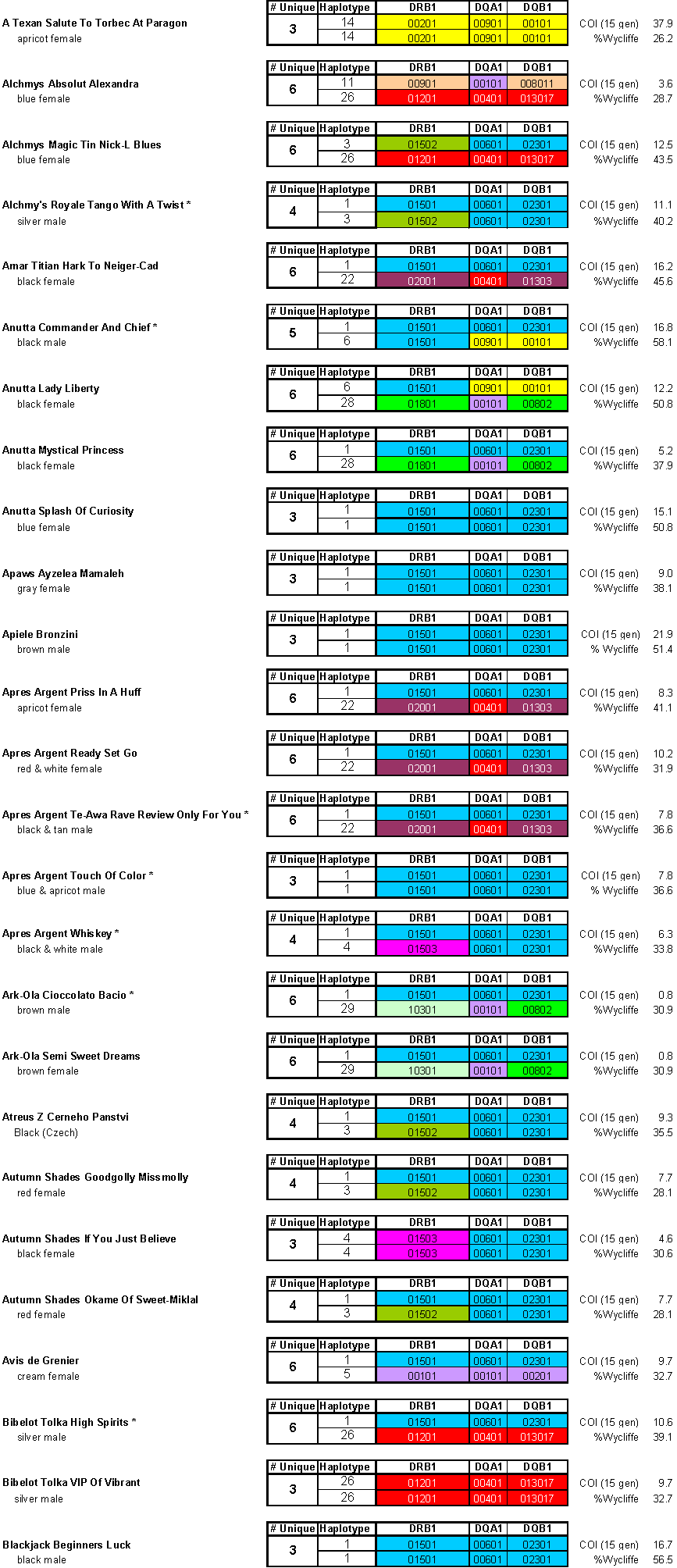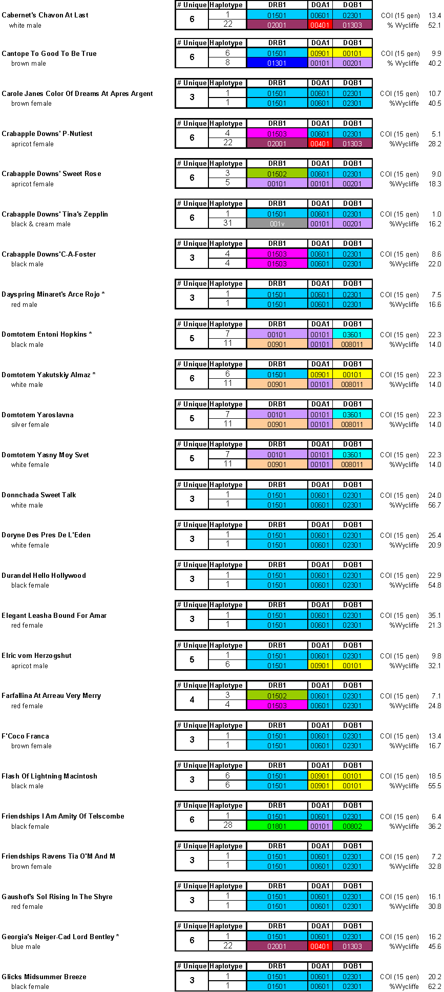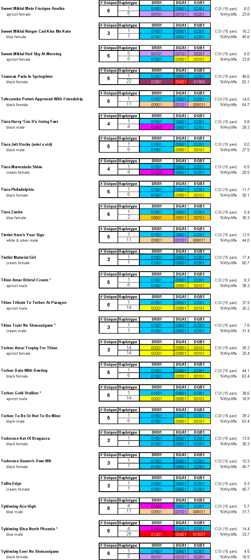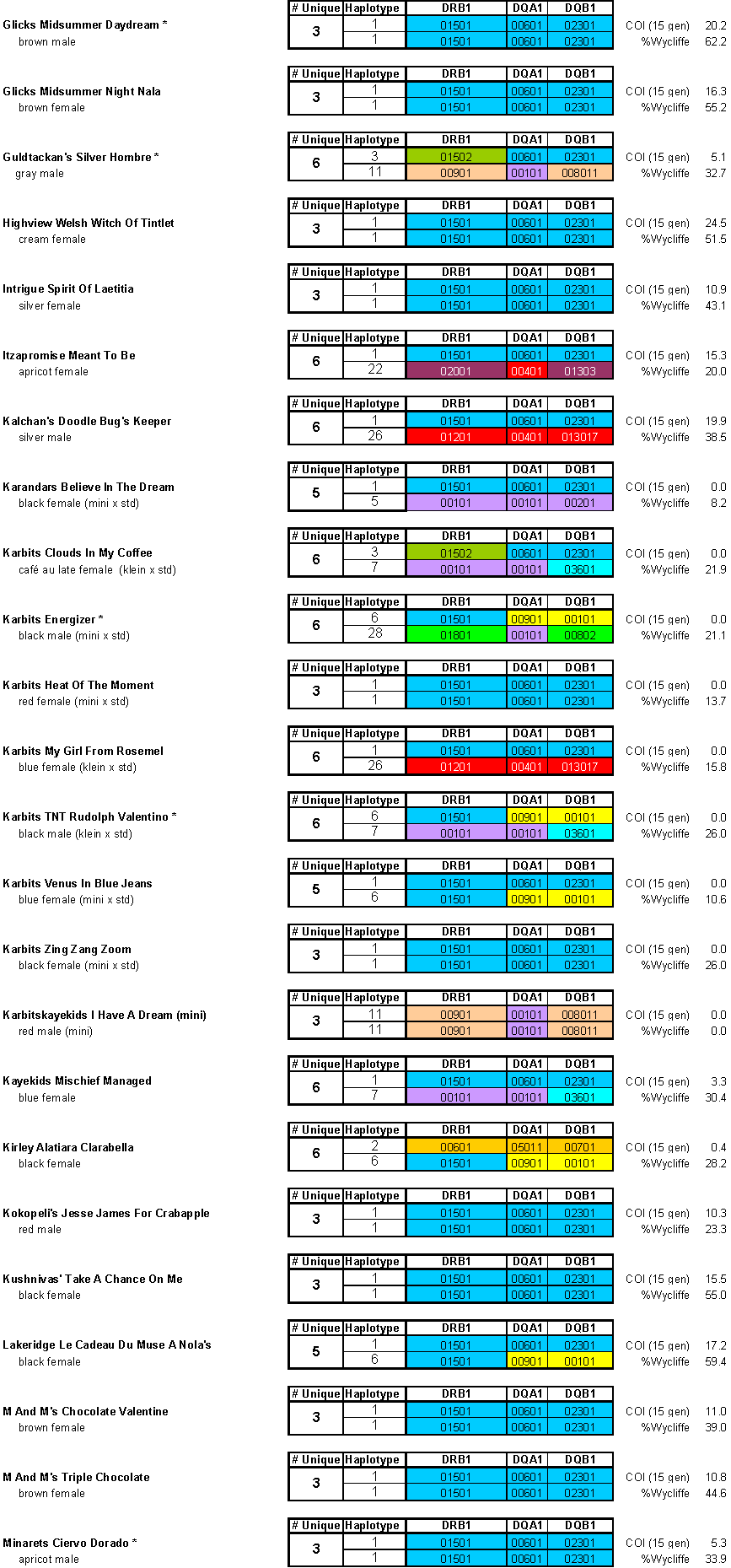 The latest results (August 2013) from the Poodle Club of Canada Study on Poodle MHC DLA Class II Haplotypes is in. Below are the color coded results of the individual participants